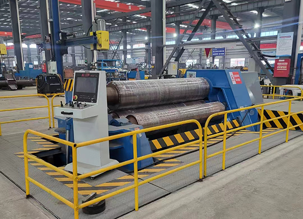 第二步是工作輥作進給運動,即進行三點彎曲,有的卷板機是上輥作壓下進給,有的是下輥或側(cè)輥作向上的進給運動,為敘述方便,根據(jù)相對運動的原理,將工件和下輥或側(cè)輥看作靜止不動的,上輥作壓下運動:卷圓筒工件上輥壓下時與下輥平行,卷錐筒工件上輥壓下時與下輥傾斜:壓下量越多,工件與上輥接觸的母線及附近曲率越大;第三步是通過工作輥的回轉(zhuǎn)運動讓工件回轉(zhuǎn),同時保證上輥的壓下量不變,使工件的每一個母線具有相同的曲率或曲率分布,成為圓筒和錐筒。